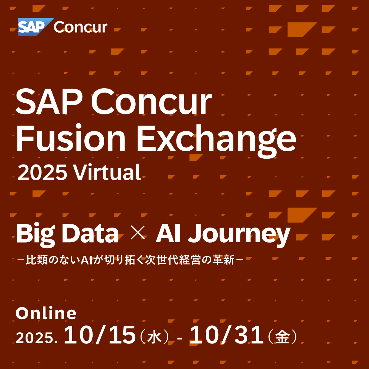 【SAP Concur Fusion Exchange 2025 Virtual】 配信期間 :2025年10月15日(水)~2025年10月31日(金) 開催形式 :オンライン 弊社講演 :コンカーセッション「AIは誰のものか?現場と経営が共創する“文化としてのAI”」